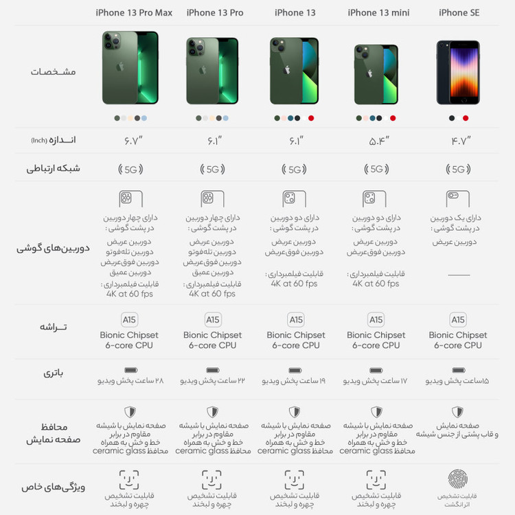 گوشی موبایل iPhone 13 CH پرچمدار جدید شرکت اپل است که با چند ویژگی جدید و دوربین دوگانه روانه بازار شده است. اپل برای ویژگیها و طراحی کلی این گوشی از همان فرمول چند سال اخیرش استفاده کرده است. نمایشگر آیفون 13 به پنل Super Retina مجهز شده است تا تصاویر بسیار مطلوبی را به کاربر عرضه کند. این نمایشگر رزولوشن بسیار بالایی دارد؛ بهطوریکه در اندازهی 6.1 اینچیاش، حدود 460 پیکسل را در هر اینچ جا داده است. امکان شارژ بیسیم باتری در این گوشی وجود دارد. روکش سرامیکی صفحهنمایش این گوشی میتواند انقلابی در محافظت بهپا کند. این گوشی ضدآب و ضد گردوخاک است. بدنه زیبا iPhone 13 در مقابل خطوخش مقاومت زیادی دارد؛ پس خیالتان از این بابت که آب و گردوغبار بهراحتی روی آیفون 13 تأثیر نمیگذارد، راحت باشد. علاوهبراین لکه و چربی هم روی این صفحهنمایش باکیفیت تأثیر چندانی ندارند. تشخیص چهره با استفاده از دوربین جلو دیگر ویژگی است که در آیفون جدید اپل به کار گرفته شده است. قابلیت اتصال به شبکههای 4G و 5G، بلوتوث نسخه 5، نسخه 15 از iOS دیگر ویژگیهای این گوشی هستند. ازنظر سختافزاری هم این گوشی از تراشهی جدید A15 بهره میبرد که دارای 15 میلیارد ترانزیستور است که دارای کنترل گرمای مطلوبی بوده که تا بتواند علاوه بر کارهای معمول، از قابلیتهای جدید واقعیت مجازی که اپل این روزها روی آن تمرکز خاصی دارد، پشتیبانی کند. به گفته خود شرکت اپل این گوشی دارای سرعتی 50 برابر نسخه 12 خود است. پردازنده دارای ماژولار جدیدی است که مصرف باتری را بسیار پایینتر آورده است و شما دارای حفظ باتری بالاتری هستید. کیفیت نمایش شما در iPhone 13 دارای 120 هرتز است و کیفیت بالایی را شاهد خواهید بود. اپل در این سری از گوشیهای iPhone خود پردازنده گرافیکیای را قرار داده که از سری 12 گوشیهای خود 30 درصد سریعتر است و این نویدبخش آن است که شما میتوانید بازیهایی را با گرافیک و MAP سنگین تر و بزرگتر اجرا کنید. یکی از ویژگیهایی که در iPhone 13 شاهد هستیم سیستم فیلمبرداری ProRes سینمایی آن است که می تواند انقلابی در فیلمبرداری گوشیهای موبایل بهراه انداخته باشد. این قابلیت میتواند نسبت به صورت روبرو بین افراد و یا بین فرد و اشیا فوکوس و بِلار داشته باشد.