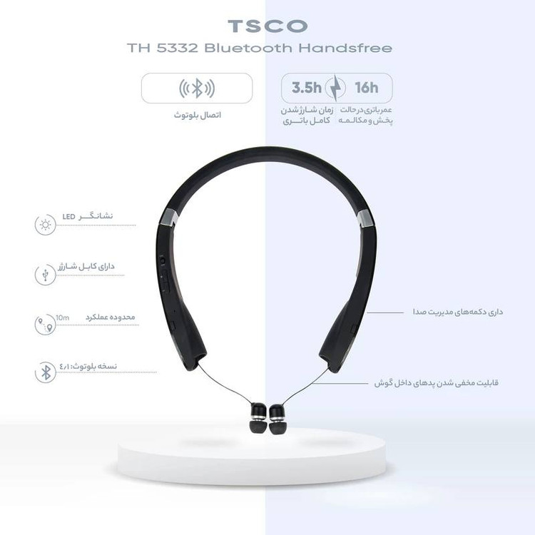 هدست گردنی تسکو مدل TH 5332 یک دستگاه صوتی فوق العاده با کیفیت است که طراحی ارگونومیک و سبک آن به شما کمک می کند تا لذت بیشتری از شنیدن موسیقی، پاسخ دادن به تماس ها و انجام تماس های صوتی را تجربه کنید. با اتصال بی سیم، کیفیت بالای صدا و عمر باتری طولانی، این هدست انتخاب مناسبی برای تمامی فعالیت های روزانه شما است.